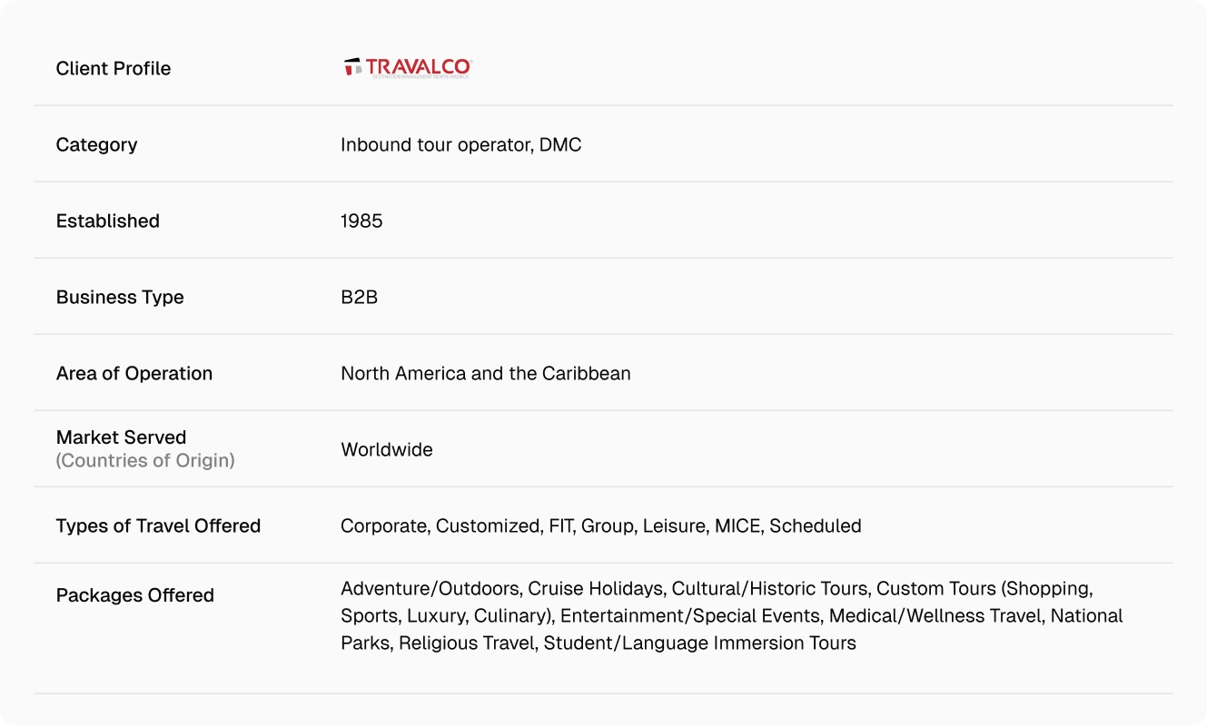 Travalco is a renowned inbound tour operator and destination management company (DMC) with a rich history dating back to 1985. As a key player in the North American and Caribbean travel sectors, Travalco specializes in arranging and assembling tours for further sales via travel agents solely on a B2B basis and offers a vast portfolio of directly contracted hotels, travel products, programs, and services to global clients.